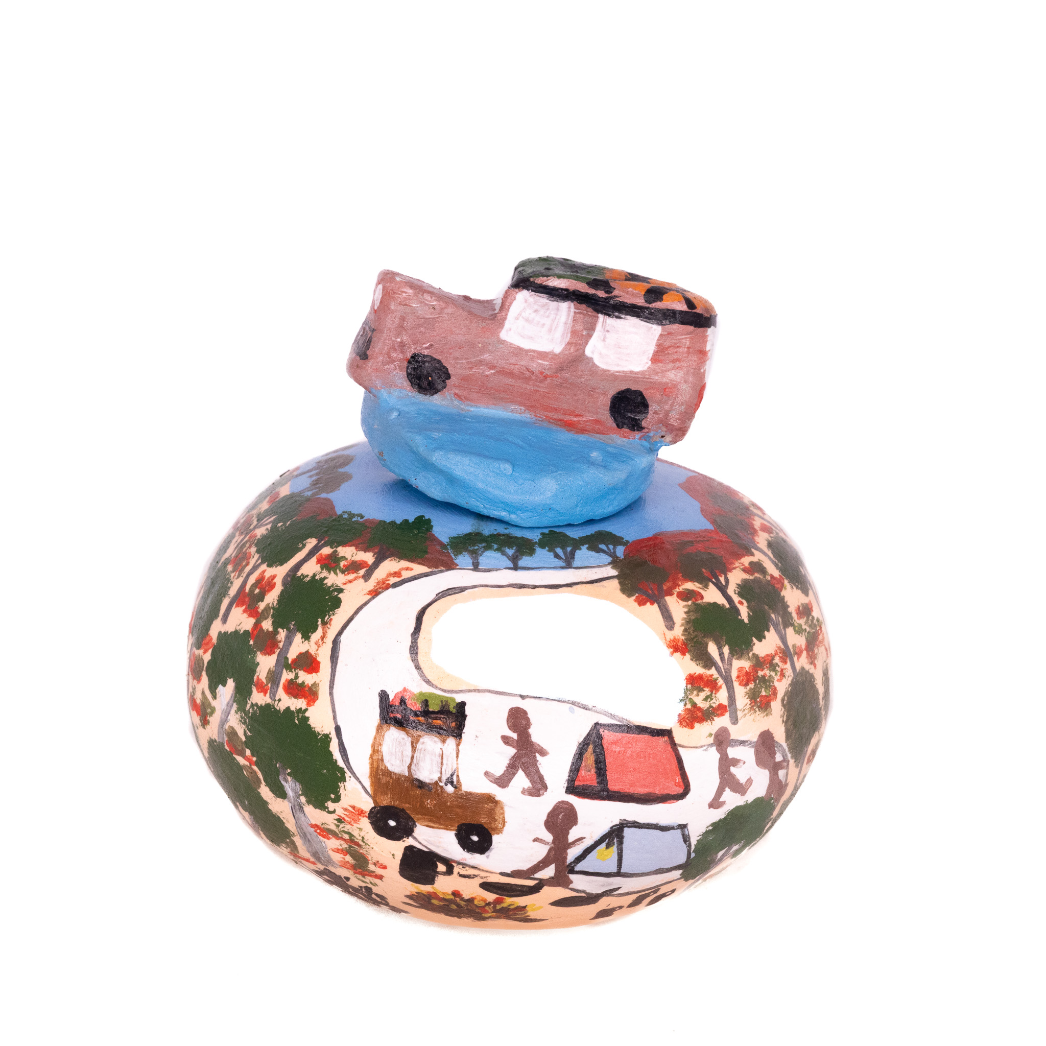 Inkarta Nahassan and my Aunty Rachel Ungwanaka used to take all her sisters children camping and swimming during summer time.we didnt like the hot heat but we looked forward swimming at the water hole. (terracotta and underglazes, 11x11.5)