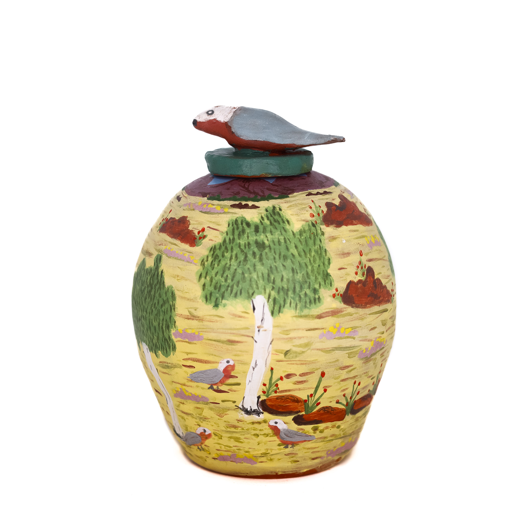 Elintja wurlerrama, tningka etna untharlaapuma. Galahs go around in big flocks. <br /> (terracotta and underglazes, 17x12x12cm)