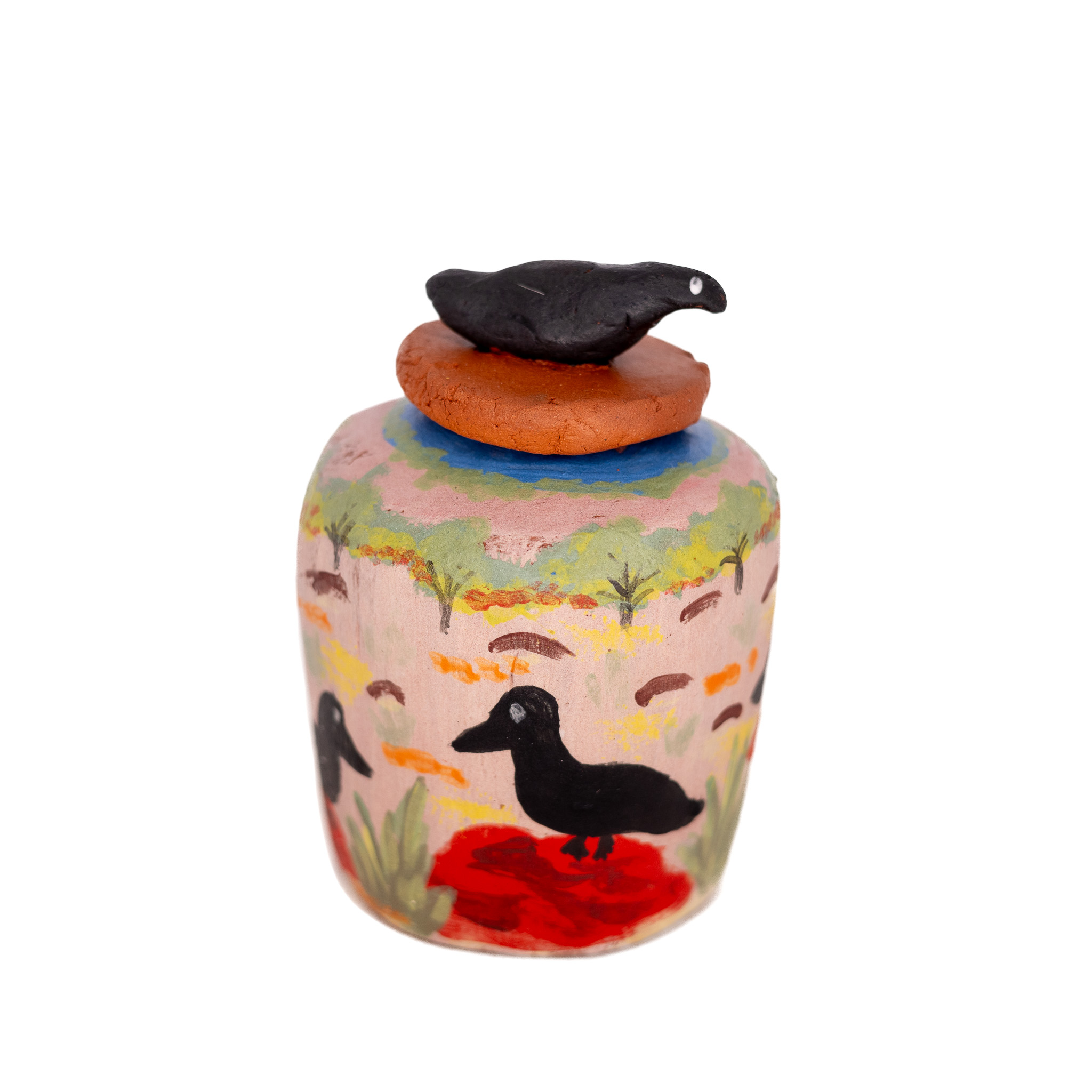 Thepa ngapa ura kwaarta aramala, era pitjima. Crows come when they see smoke. (terracotta and underglazes, 10 x 7cm)