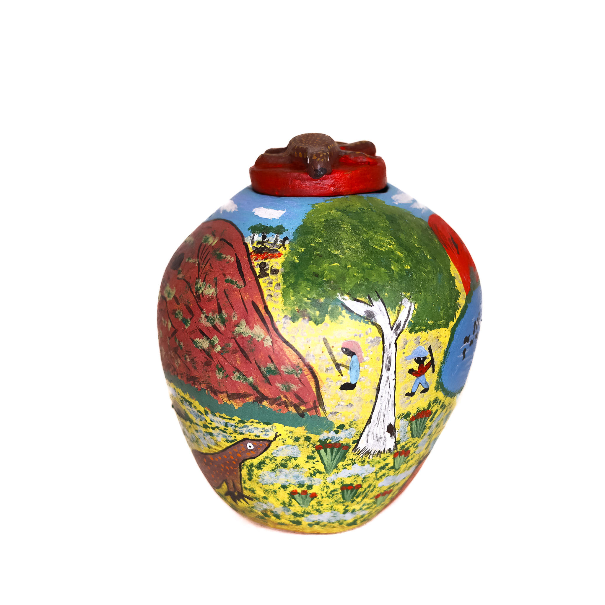 Goanna's are the totems of my family - they roam Arrernte Country, looking for tucker. (terracotta and glazes, 22x15x15cm)