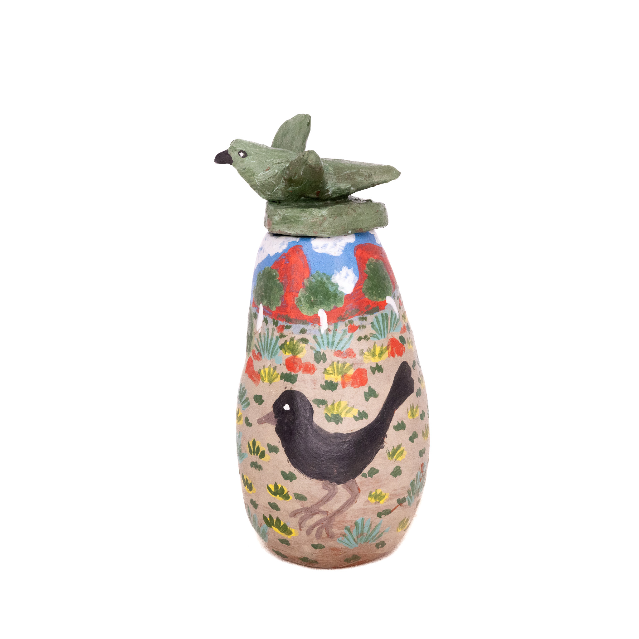 Urlpaatja-la rraatninga anga ilkuma. Green parrots eat wild passionfruit seeds. (terracotta and underglazes, 17 x 8cm)