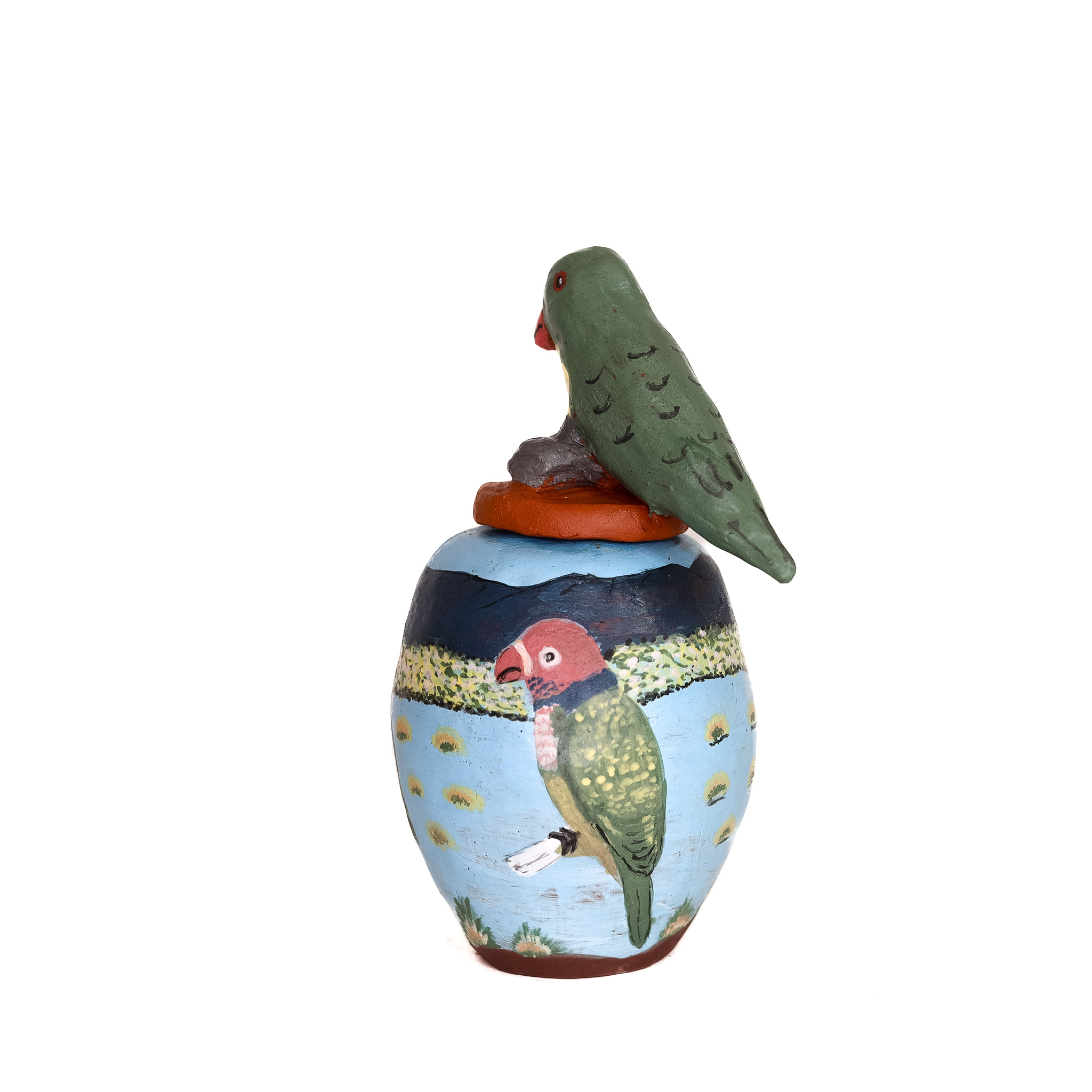 Urlpaatja-la rraatninga anga ilkuma. Green parrots eat wild passionfruit seeds. (terracotta and glazes, 21x10x10cm)